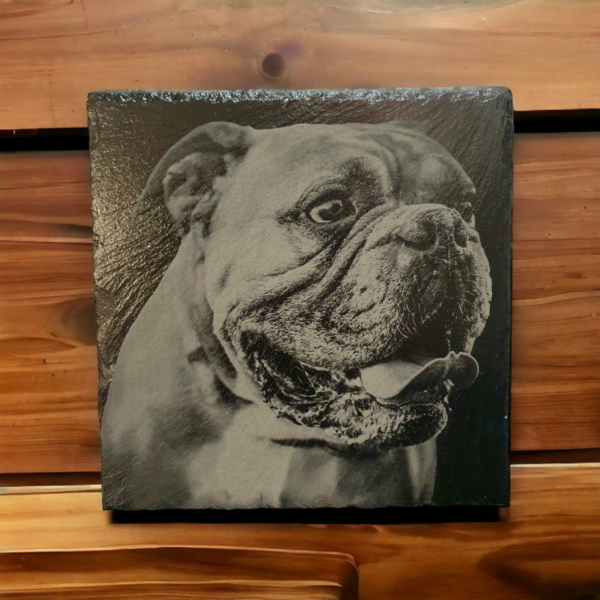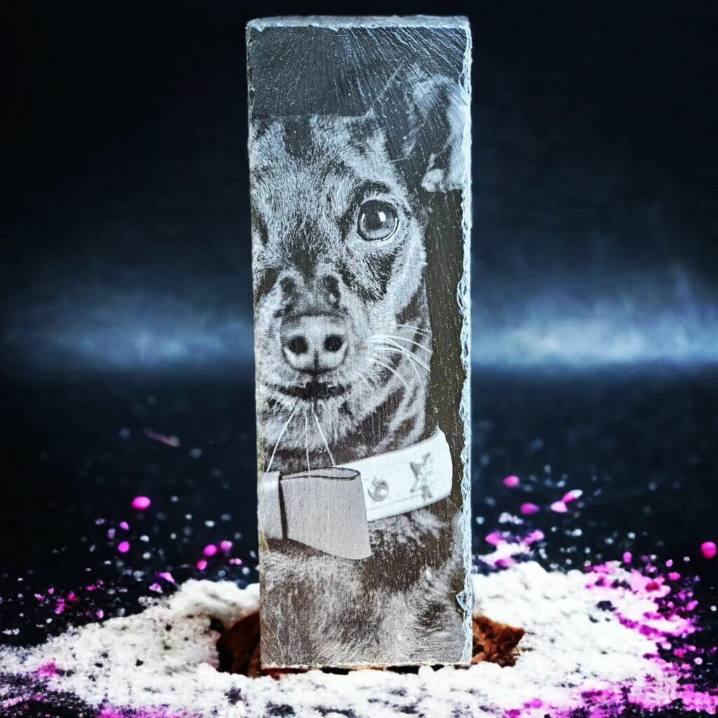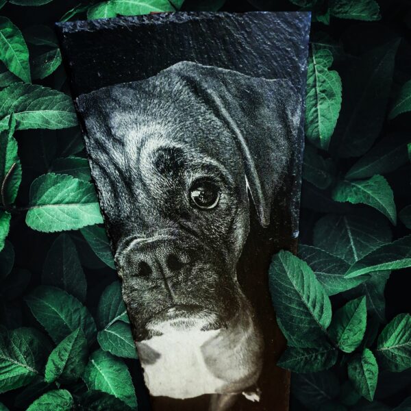 Die Schiefergravur ist eine Kunst, die sich auf die kraftvolle Kombination von Technologie und Handwerkskunst stützt. Mit modernsten Gravurtechniken wird jedes Detail des Haustiers präzise auf die natürliche Oberfläche des Schiefers übertragen. Das Ergebnis ist ein lebensechtes Abbild, das die individuellen Merkmale, den Ausdruck und die Persönlichkeit des Tieres einfängt. Jede Schiefergravur erzählt eine Geschichte, von spielerischer Verspieltheit bis zu ruhiger Weisheit.
