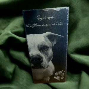 Ich biete eine einzigartige Möglichkeit, eine bleibende Erinnerung an Ihr geliebtes Haustier zu schaffen. Meine personalisierten Schiefergravuren werden individuell für Sie angefertigt und sind eine perfekte Möglichkeit, die einzigartigen Eigenschaften und Merkmale Ihres Haustiers zu ehren.